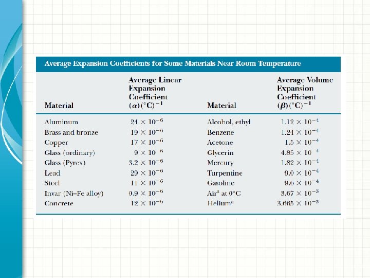 Average Volume Expansion § Because the linear dimensions of an object change with temperature, it follows that surface area and volume change as well. § The change in volume is proportional to the initial volume Vi and to the change in temperature according to the relationship; § where β is the average coefficient of volume expansion. § Β = 3α