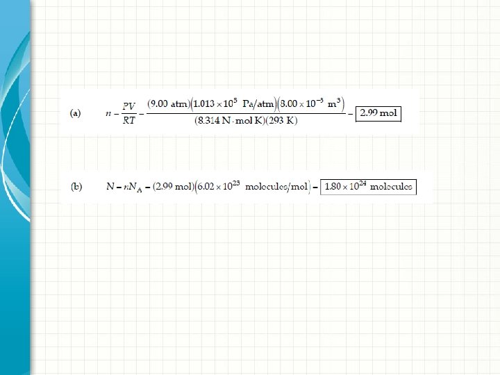 Example 4 Gas is contained in an 8. 00 -L vessel at a temperature of 20. 0°C and a pressure of 9. 00 atm. (a) Determine the number of moles of gas in the vessel. (b) How many molecules are there in the vessel? Solution
