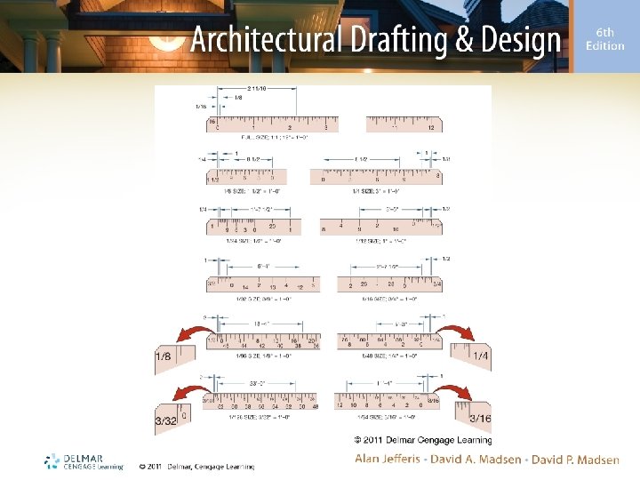 • Architect’s Scale - 11 different scales – – – Locate the correct scale before beginning Ten of the scales are based on the inch unit Other scale is divided into 1/16 th of an inch Be careful to watch reading direction 1/4”=1’-0” Residential 1/8”=1’-0” Commercial