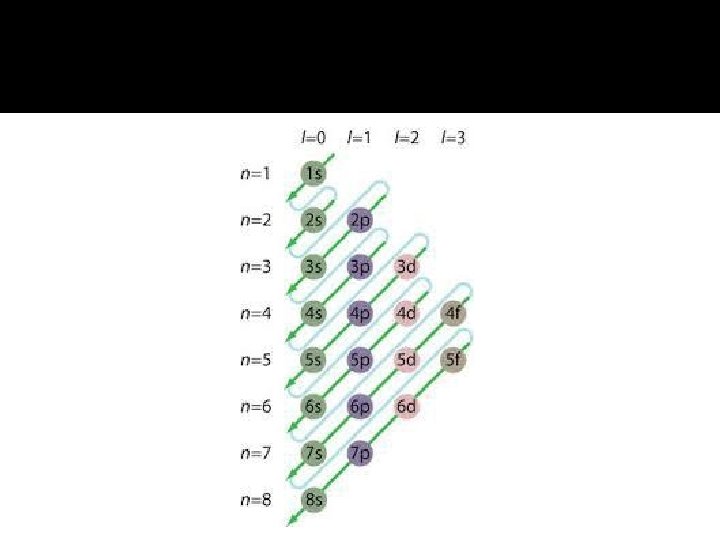 Electron Configurations � The electron configuration is a way of how electrons are arranged in various orbitals around the nuclei of an atom � The Pauli Exclusion Principle States that no two electrons in the same atom may have the same series of quantum numbers. An atomic orbital describes at most two electrons � The Aufbau Principle According to this principle, electrons occupy the orbitals of lowest energy first. � Hund’s Rule States that in subshells, as far as possible, electrons will half fill orbitals with parallel spins.