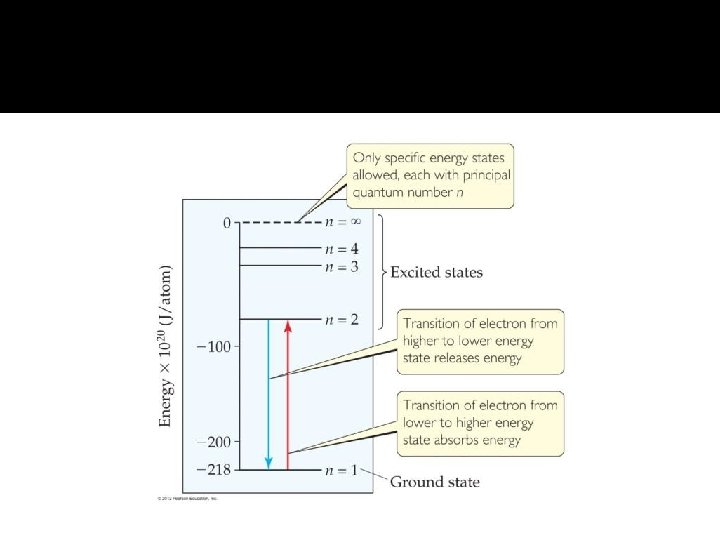 Quantized Energy and Photons � Max Planck explained the phenomena of energy absorption and emission by the concept that energy is comprised of discrete units, which he called quanta. � Frequency is directly related to energy by Planck’s constant (h) which is 6. 626 x 10 -34 j. s. � Therefore, if one knows the wavelength of light, one can calculate the energy in one photon, or packet, of that light: E = hv or E = hc/λ