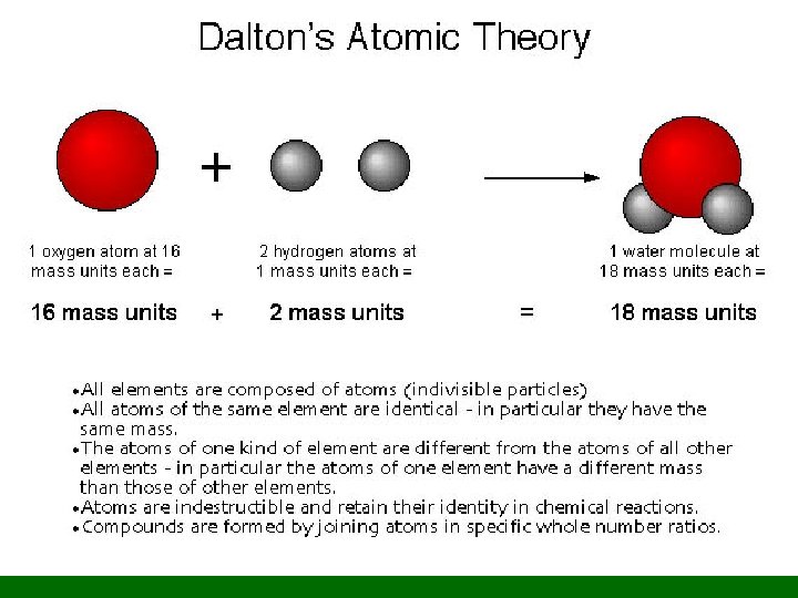Atomic Theory • Elements made of atoms • Atoms are identical of a given type of element • Atoms neither created nor destroyed • Compounds have fixed ratio of atoms