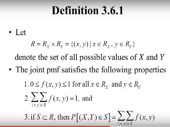 Joint pmf • The joint pmf of a the discrete random variables X and Y is • f(x, y)=P(X=x, Y=y)
