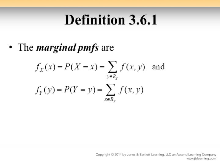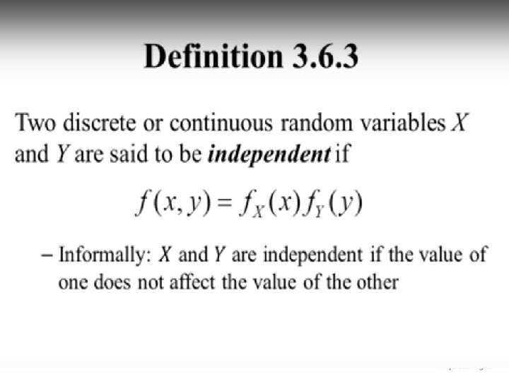 Marginal Distributions The marginal probability density functions, or marginal p. d. f. ’s, of X and Y are Definition 3. 6. 3 Two discrete or continuous random variables X and Y are said to be independent if