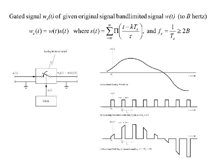 Pulse Amplitude Modulation (PAM) • Baseband operation • Transforming continuous time analog signals into discrete time analog pulses • Information carried in amplitude of pulses. • First step in the analog to digital conversion (A/D) • Pre-cursor to Pulse Code Modulation (PCM) • Sometimes, PAM signals are used directly for transmission without making it into PCM • Two types of PAM – Gating – Sample and hold