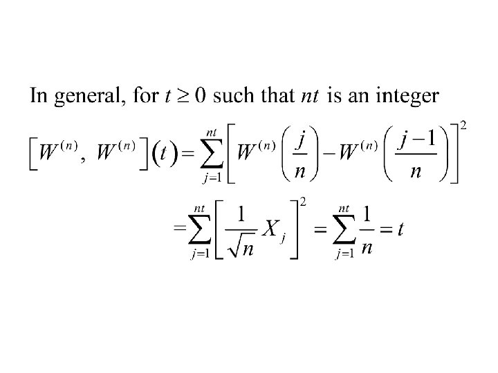 Note • nt is an integer • If nt isn’t an integer, we define by linear interpolation between its value at the nearest points s and u to the left and right of t for which ns and nu are integers • Obtain a Brownian motion in the limit as
