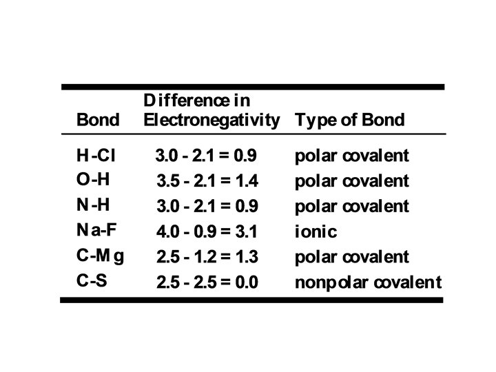 In a polar covalent bond – the more electronegative atom gains a greater fraction of the shared electrons and acquires a partial negative charge ( -) – the less electronegative atom acquires a partial positive charge ( +)