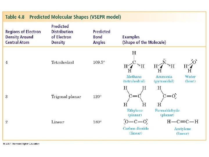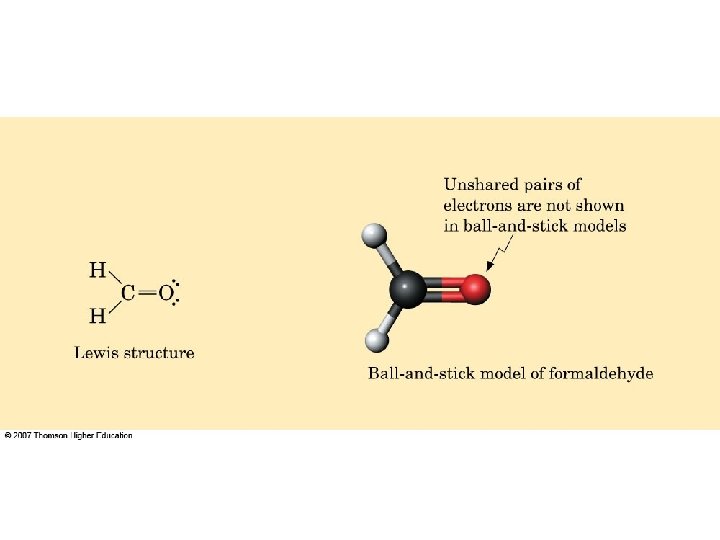 Predict the shape of formaldehyde, CH 2 O – The Lewis structure shows carbon surrounded by 3 regions of electron density; 2 with single pairs of e- and one with 2 pairs of e- forming the double bond to oxygen. – According to the VSEPR model, the three regions radiate from carbon at angles of 120°, and the shape of the molecule is planar (trigonal planar). – The measured H-C-H bond angle is 116. 5°.