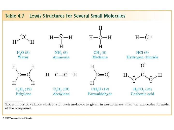 Drawing Lewis Structures Count the number of valence electrons • For a molecule add up the valence electrons of the atoms present. Draw a skeleton structure joining atoms by single bonds • The central atom is usually written first in the formula Determine the number of valence e- still available • Subtract two e- for each single bond written Determine the number of valence electrons required to fill an octet for each atom (except H) • • If e- available = e- required distribute available e- as unshared pairs If the number of e- available is less than the number required by two echange a single bond into a double bond. If you are four e- short convert a single bond into a triple bond. C, N, O and S can form multiple bonds. Hydrogen and halogens never form double bonds.