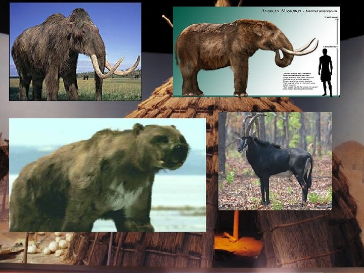 C. Paleo Indians a. Nomadic (wandering from place to place) biggame hunters followed the animals, their food source, deeper into America. Many animals of the day were much bigger than animals today. The enormous game animals of prehistoric Oklahoma included gigantic six-foot tall bison, short-faced bear, camel, horse, ground sloth, antelope, mastodon, and Columbian and Imperial mammoths.
