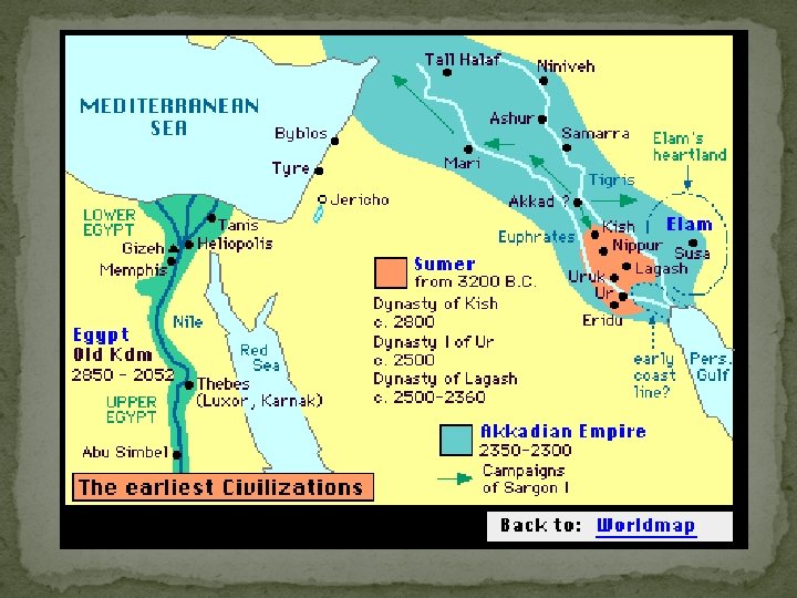 What were the earliest civilizations? � Sumer civilization was oldest �Southern Mesopotamia (fertile crescent) �Between 3500 and 3000 b. c. e. �First written language � Egyptian civilization appeared around same time �Nile River Valley �Smaller Nubian civilization to its south � Norte Chico civilization �Central coastal Peru �Emerged between 3000 and 1800 b. c. e. �Unique from other civilizations because: Smaller cities without walls or signs of pervasive warfare Less evidence of economic specialization No grain-based agriculture Did not develop certain technologies like pottery No writing system Little outside trade/imports