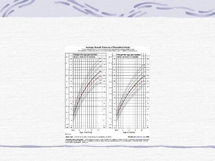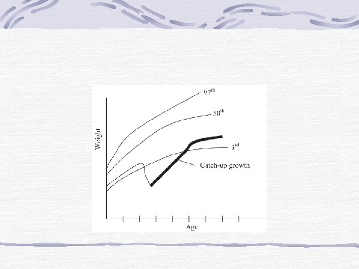 Growth Chart Growth charts are the primary tools for the recognition of unusual growth. Consist of a set of smoothed curves for selected percentiles with accompanying tables of means and standard deviations. Some of these charts were developed from nationally representative samples to obtain estimates for total populations. The curves are usually for that 3 rd, 5 th. 10 th. 25 th, 50 th, 75 th, 90 th, 95 th, and 97 th, percentiles. For example, when there are 100 children in an age group, the 3 rd percentile value depends upon only the smallest three to four observations. Children whose measurements fall within the 5 th and 95 th percentiles are generally considered within the normal growth range. Sudden or sustained changes in percentile may indicate a chronic disorder, emotional difficulty, or nutritional intake problem. These findings require further assessment or the physical status of the child as well as other types of evaluations such as dietary intake or serum laboratory measurements.