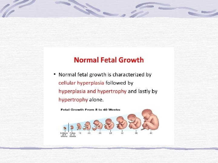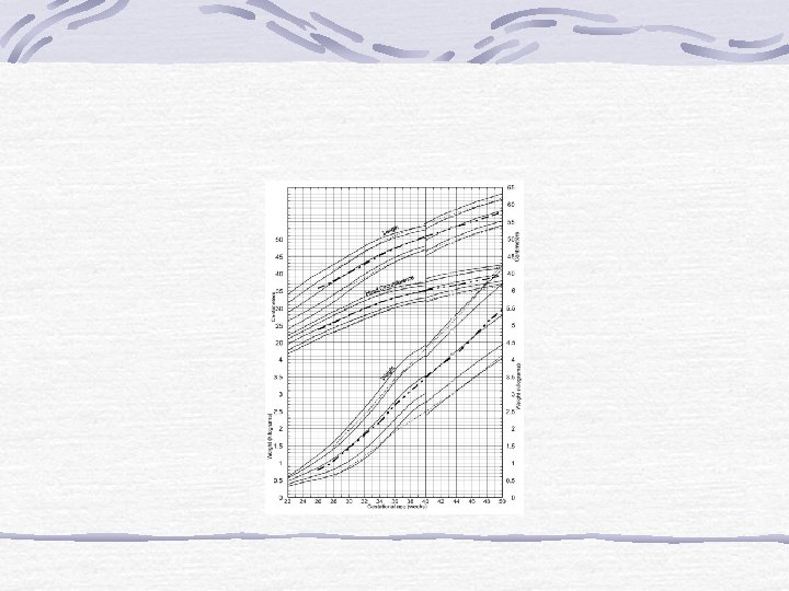 Fetal heart sounds can be heard with a fetoscope by 18 to 20 weeks of gestation and by electronic Doppler can detect heart motion at 10 weeks of gestation. The fetus is less vulnerable to teratogenic agents but may interrupt normal functional development of organs particularly the brain. Assessment of Growth Assessment of infant' growth is crucial during different stages of life because periodic assessment of infants and children permits early detection of growth deficiencies and deviations from normal standards. During assessment the midwife should take the following points in her consideration: Physical growth assessment is usually carried out using tables and charts. The measurements which are commonly done are weight, length , head circumference. Newly chest circumference is done for newborns to assess fetal growth at birth.
