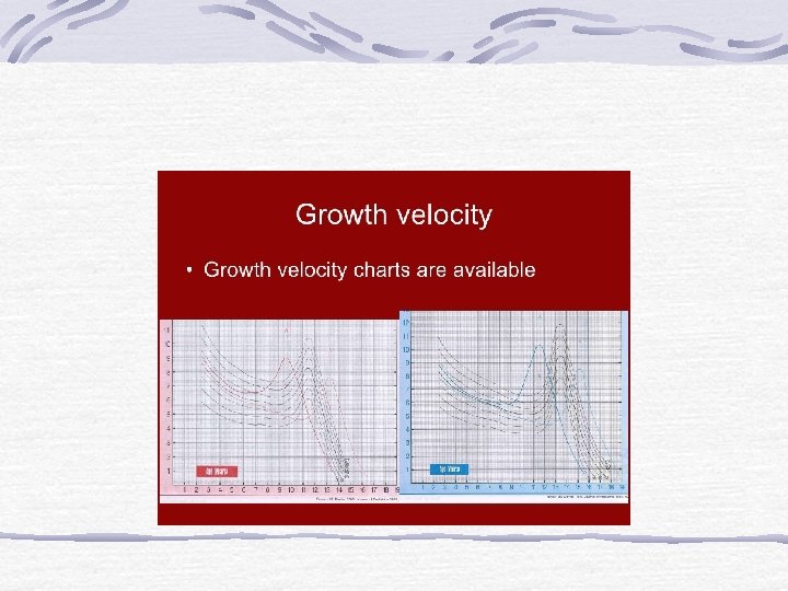 There is wide range of normal variation among infants and children of the same chronological age. These normal differences are described in terms or percentiles. Comparison of the child percentile with those of the previous examination of the same child can detect abnormalities in his growth. Not all measurements of the same child necessarily fall into the same percentile, but each measurement should follow its own percentile in a healthy child. Methods to Evaluate Growth Charts: compare to norms Compare to self over time X rays Teeth Length , weight, head circumference Size of head and legs: length of bones