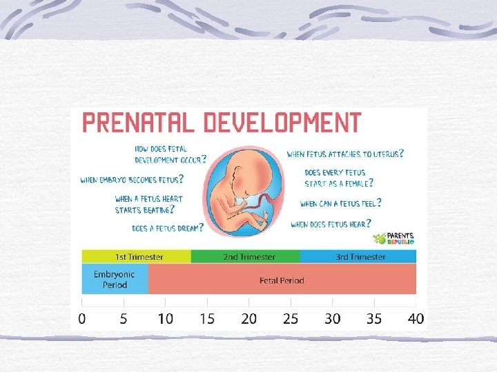 Chapter 3 Intrauterine Fetal Development The growth and development of the fetus is typically divided into three stages: Pre embryonic (ovum) stage (fertilization to 2 -3 weeks): The concepts is called an ovum during the period from conception until primary villi appear 12 -14 days after fertilization or 4 weeks since LMP. Rapid cell division and differentiation was occurred Develop embryonic membrane. The inner cell mass of blastocyst forming fetus that the cells differentiate into three primary gems layers: The ectoderm (ecto = outside) Gives skin, nails, tooth and nervous system. The endoderm (endo =inner) Gives the epithelial inner lining of GIT, respiratory system, endocrine glands and auditory canal. The mesoderm (meso = middle) Gives the connective tissue, muscle, blood and vascular system.