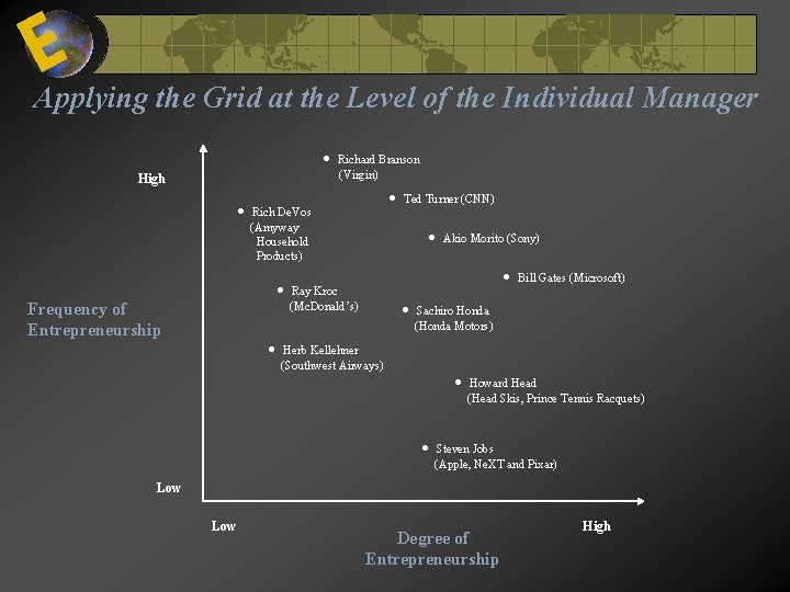 E Applying the Grid at the Level of the Individual Manager High Rich De. Vos (Amyway Household Products) Frequency of Entrepreneurship Richard Branson (Virgin) Ted Turner (CNN) Akio Morito (Sony) Ray Kroc (Mc. Donald’s) Bill Gates (Microsoft) Sachiro Honda (Honda Motors) Herb Kellehner (Southwest Airways) Howard Head (Head Skis, Prince Tennis Racquets) Steven Jobs (Apple, Ne. XT and Pixar) Low Degree of Entrepreneurship High