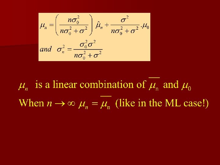 n Maximum-Likelihood Estimation § Has good convergence properties as the sample size increases § Simpler than any other alternative techniques – General principle § Assume we have c classes and P(x | j) ~ N( j, j) P(x | j) P (x | j, j) where: 2
