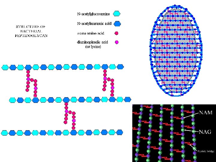 The Bacterial Cell Wall - Composition The bacterial cell wall is made of a chemically complex substance called peptidoglycan, which is made of long chains of modified sugars that are cross-linked by chains of amino acids. (peptides) The sugars are N-acetylglucosamine (NAG) and N-acetylmuramic acid (NAM). (See figure 3. 11 of your textbook. ) (Chitin, found in fungal cell walls, insect shells and cartilage, is made of NAG. ) NAM is rarely found in nature, except in the bacterial cell wall, so the discovery of NAM in a sample is an indication of bacterial contamination. The cross-linking peptide chains are made of amino acids linked by amide bonds like those found in proteins. However, peptidoglycan contains several unusual amino acids that are never seen in proteins, including: D-alanine, ornithine and diaminopimelic acid. Presence of D-alanine or diaminopimelic acid in a sample is another indication of the presence of bacteria.