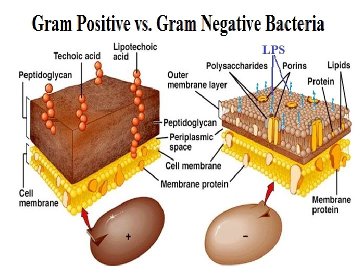 Lipopolysaccharide (LPS) LPS is found in the Gram negative outer membrane. The lipid A portion is embedded in the membrane, the O-antigen is a sugar polymer that sticks out on the outer surface and R-core joins Lipid A to O-antigen. LPS is also known as bacterial endotoxin. LPS is a potent pyrogen, a nonspecific activator of the immune response that causes the host to have fever. LPS is released from dead cells that are decomposing (lysing) and some is released from dividing cells. Teichoic acids are components of the thick cell walls of Gram positive bacteria. Teichoic acids are polymers of sugar acids. TA helps bind together the layers of peptidoglycan in the thick wall. Lipoteichoic acids help anchor the cell wall to the cell membrane.