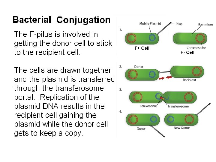 Bacterial Appendages - Continued Pili or Fimbrae - Pili are hollow tubes of protein that stick out on the outer surface of bacteria. - Pili are about the same diameter as flagella but are shorter and straight. - Pili help bacteria to stick to surfaces and to each other. - Some pili are virulence factors that allow pathogenic bacteria to stick to host cells. - Other pili are important for the formation of biofilms. - In some strains of E. coli there is a special pilus made called the F-pilus. This pilus causes two cells to stick together so DNA can be transferred from one to the other by conjugation. (F is "fertility". )