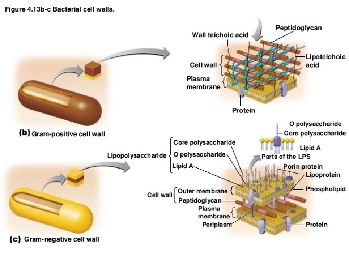 Bacterial Cell Walls - Composed of a complex polysaccharide called Peptidoglycan - Chains of sugars are connected by crossbridges of amino acids - Two types of cell walls: gram negative and gram positive