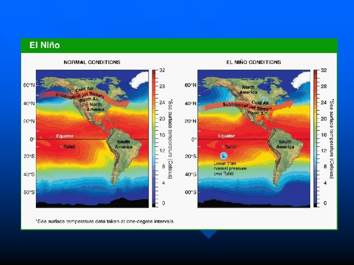El Nino & La Nina El Nino n n n Warming of the water in the Pacific Ocean High Pressure Every 3 -7 Years Affect on U. S. ? n Heavy Rain or Drought La Nina n n n Cooling of the water in the Pacific Ocean Low Pressure Every 3 -7 Years