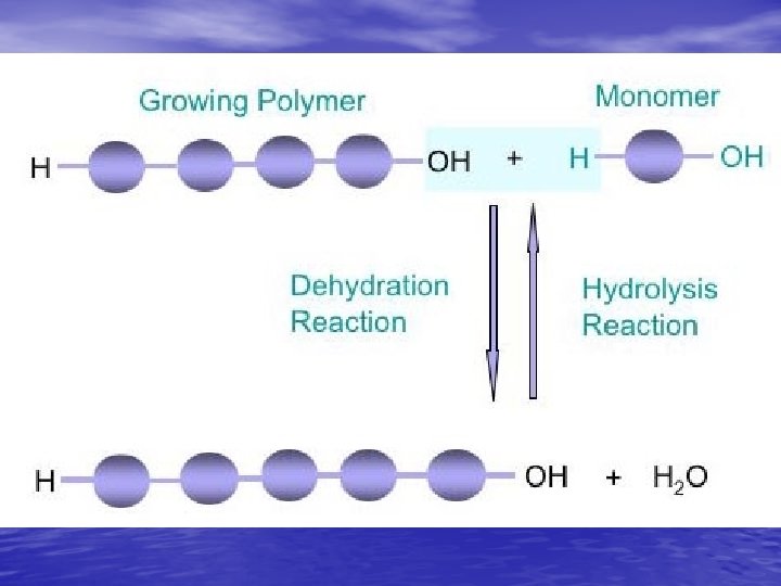 Condensation reactions stores energy Removal of water to build larger molecules; form bonds while losing a water molecule