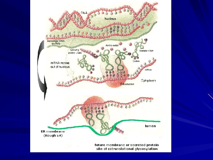 – Translation – in cytoplasm m. RNA attaches to ribosome & moves through like a ribbon t. RNA transfers individual amino acids to ribosome – have anticodon to match up correct amino acids ribosome moves m. RNA to next codon enzymes bind amino acids together