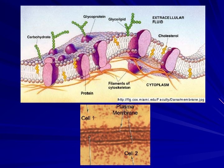– (2)Plasma membrane – selective permeability Phospholipids bilayer – Heads – hydrophilic – Tails – hydrophobic – keeps the membrane impermeable to most water soluble molecules Cholesterol – found throughout – stabilizes Proteins – specialized functions – Receptors – cell exterior – Binding sites – Transport Protein channels – opening through membrane Carriers – bind to & carry material in/out – Glycoproteins – have sugars attached Determine blood type