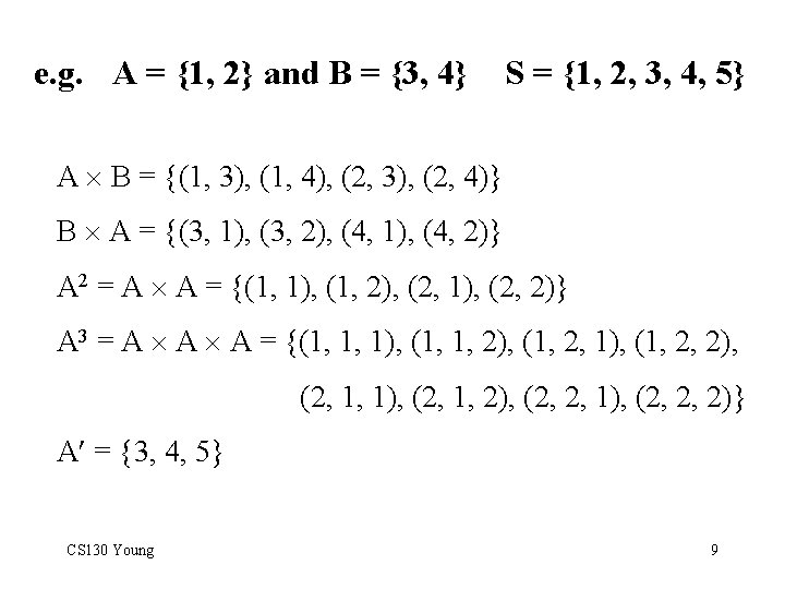 Venn Diagrams S- the Universal Set A B B A Intersection A B Union A B S- the Universal Set A B Difference A – B CS 130 Young A Complement A 8