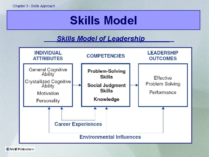Chapter 3 - Skills Approach Skills-Based Model v Skills Model Perspective v Skills-Based Model – Competencies – Individual Attributes – Leadership Outcomes – Career Experiences – Environmental Influences