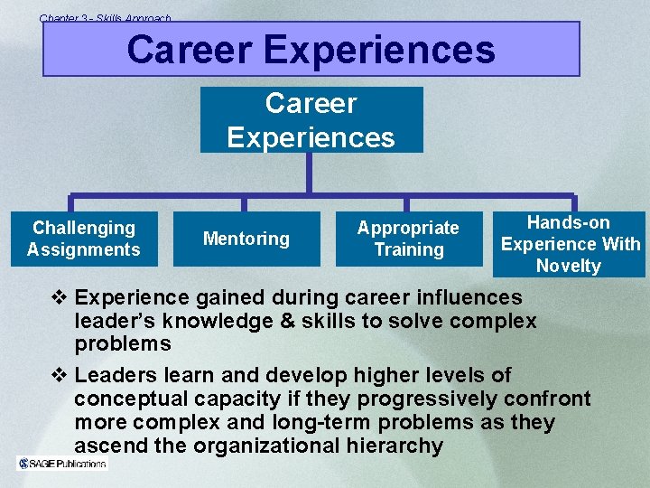 Chapter 3 - Skills Approach Career Experiences Challenging Assignments Mentoring Appropriate Training Hands-on Experience With Novelty v Experience gained during career influences leader’s knowledge & skills to solve complex problems v Leaders learn and develop higher levels of conceptual capacity if they progressively confront more complex and long-term problems as they ascend the organizational hierarchy