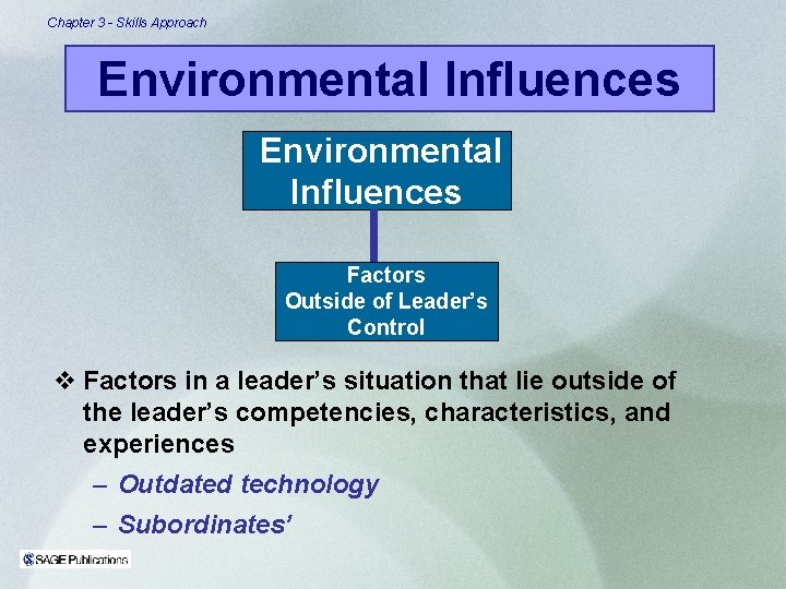 Chapter 3 - Skills Approach Environmental Influences Factors Outside of Leader’s Control v Factors in a leader’s situation that lie outside of the leader’s competencies, characteristics, and experiences – Outdated technology – Subordinates’