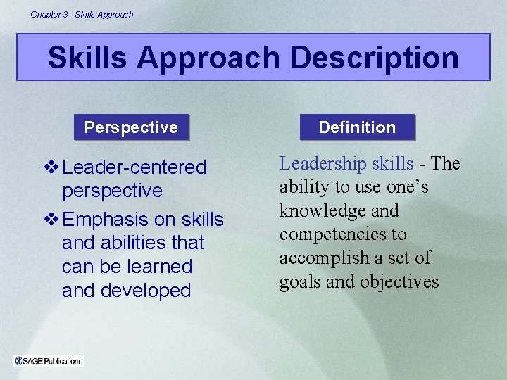 Chapter 3 - Skills Approach Overview v Skills Approach Perspective v Three-Skill Approach (Katz, 1955) v Skills-Based Model (Mumford, et al, 2000) v How Does the Skills Approach Work?