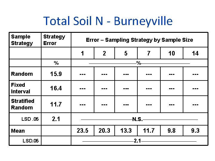 Total Soil N - Burneyville Sample Strategy Error – Sampling Strategy by Sample Size 1 % 2 5 7 10 14 ______________%______________ Random 15. 9 --- --- --- Fixed Interval 16. 4 --- --- --- Stratified Random 11. 7 --- --- --- LSD. 05 Mean LSD. 05 2. 1 _____________ N. S. ______________ 23. 5 20. 3 13. 3 11. 7 9. 8 9. 3 _____________ 2. 1______________