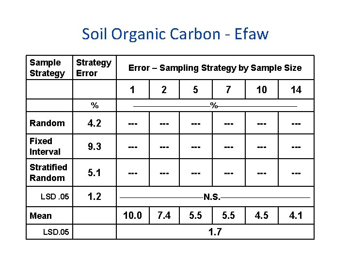 Soil Organic Carbon - Efaw Sample Strategy Error – Sampling Strategy by Sample Size 1 % 2 5 7 10 14 ______________%______________ Random 4. 2 --- --- --- Fixed Interval 9. 3 --- --- --- Stratified Random 5. 1 --- --- --- LSD. 05 1. 2 Mean LSD. 05 _____________ N. S. ______________ 10. 0 7. 4 5. 5 1. 7 4. 5 4. 1