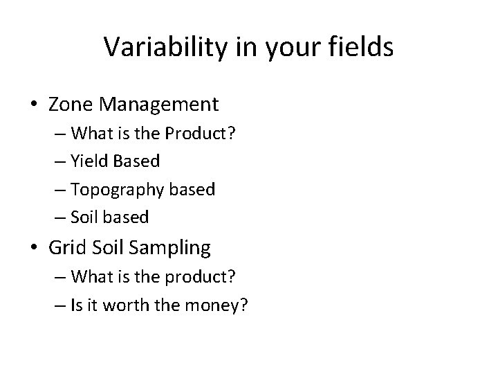 Variability in your fields • Zone Management – What is the Product? – Yield Based – Topography based – Soil based • Grid Soil Sampling – What is the product? – Is it worth the money?