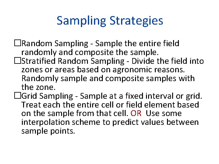 Sampling Strategies �Random Sampling - Sample the entire field randomly and composite the sample. �Stratified Random Sampling - Divide the field into zones or areas based on agronomic reasons. Randomly sample and composite samples with the zone. �Grid Sampling - Sample at a fixed interval or grid. Treat each the entire cell or field element based on the sample from that cell. OR Use some interpolation scheme to predict values between sample points.