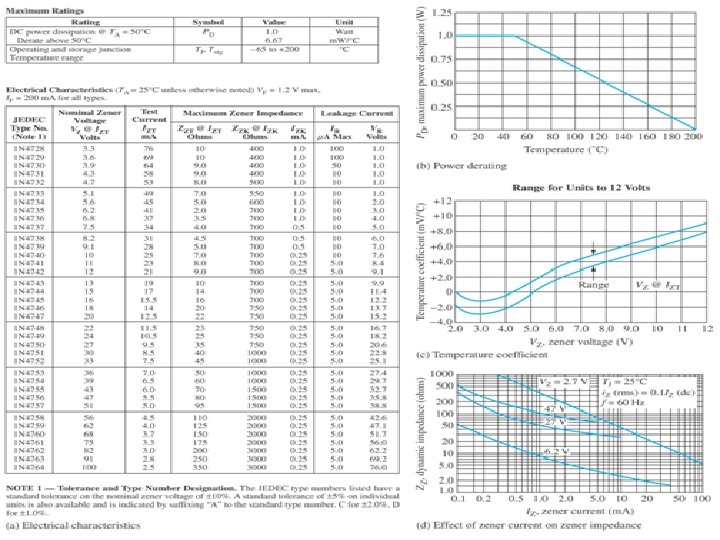 TEMPERATURE COEFFICIENT & ZENER POWER DISSIPATION & DERATING � As with most devices, zener diodes have given characteristics such as temperature coefficients and power ratings that have to be considered. � The data sheet provides this information (refer Figure 3 -7).