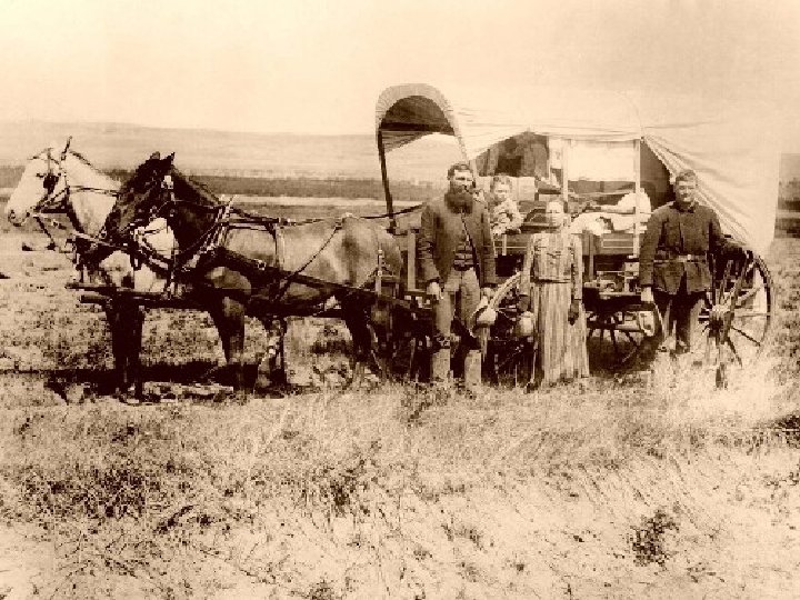 Oregon Trail Independence, Missouri, to Oregon City, Oregon -originated in 1836 when two Methodist missionaries dared to prove a covered wagon could make it to Fort Boise -Some traveled in the ‘prairie schooners’, covered wagons -However, most walked, pushing handcarts loaded with a few precious possessions, food, and other supplies -The trip took months, even if all went well