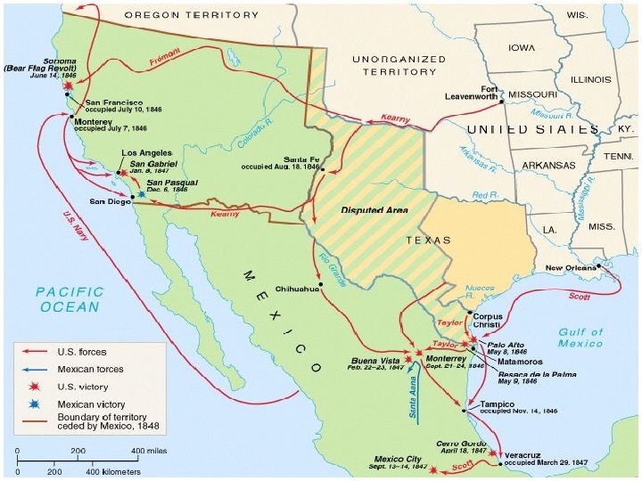 America Wins the War After about a year of fighting, Mexico conceded the defeat Zachary Taylor and Winfield Scott had done damage in Mexico, winning battle after battle February 2, 1848 - the U. S. and Mexico sign the Treaty of Guadalupe Hidalgo We got the Texas border , New Mexico, and California The U. S. agreed to pay $15 Million for California, Nevada, New Mexico, Utah, most of Arizona, and parts of Colorado and Wyoming