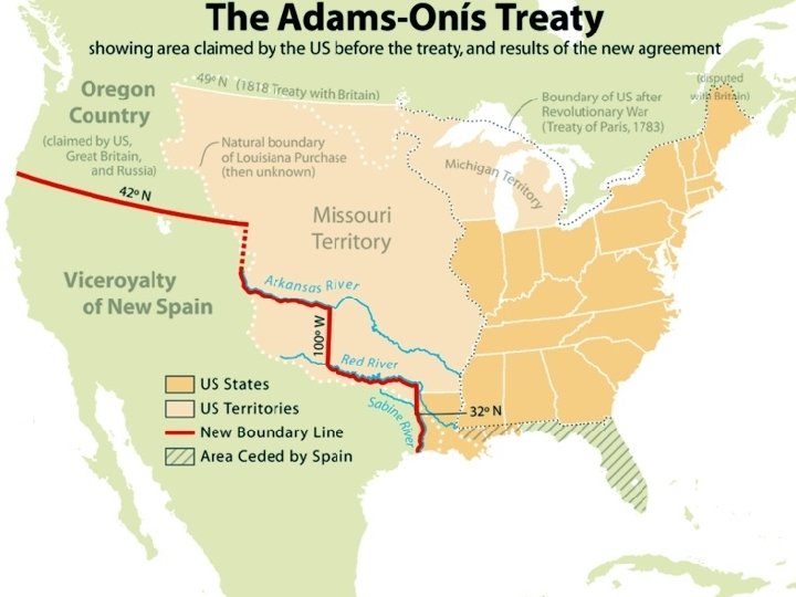 Nationalism Shapes Foreign Policy – Territory and Boundaries • While president Adams focused on expansion. – – Took Michigan to Rocky Mountains Shared Oregon territory with Britain Convinced Spain to give Florida to America Onis Treaty: established western boundary for US
