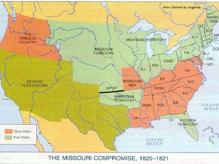 Balancing Nationalism and Sectionalism – The Missouri Compromise • Still sectional conflicts • Missouri wanted to be part of the union but the North and South argued whether it should be entered as a free state or a slave state. • Clay helps organize Missouri Compromise: – Maine admitted as free and Missouri as slave state – Rest of Louisiana Territory divided in 2: » At 36 degrees 30’ north. South of line slavery was legal. North of line, except Missouri, slavery was illegal.