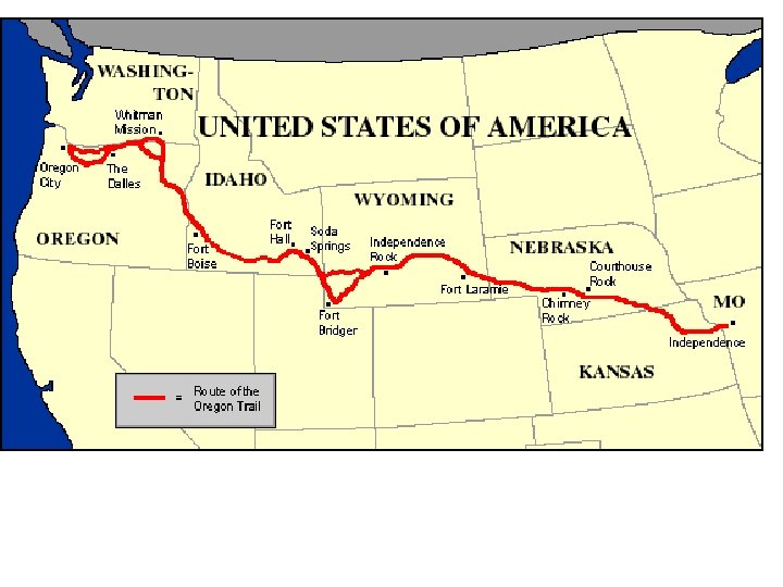 Settling the Frontier – Trails West • Santa Fe Trail: 780 miles from Independence, Missouri to Santa Fe in Mexican territory of New Mexico. – Traveled in groups of 100 wagons. – Once in Santa Fe quickly raced to land. – Traded for a few days then restocked their wagons and went back to Missouri • Oregon Trail: Independence, Missouri to Oregon City, Oregon. – Missionaries showed wagons can travel on Oregon Trail – Traveled on “prairie schooners” (wooden-wheeled wagons covered with sailcloth and pulled by oxen) or by foot (majority) while pushing handcarts loaded with precious possessions, food, and other supplies – Trip took months