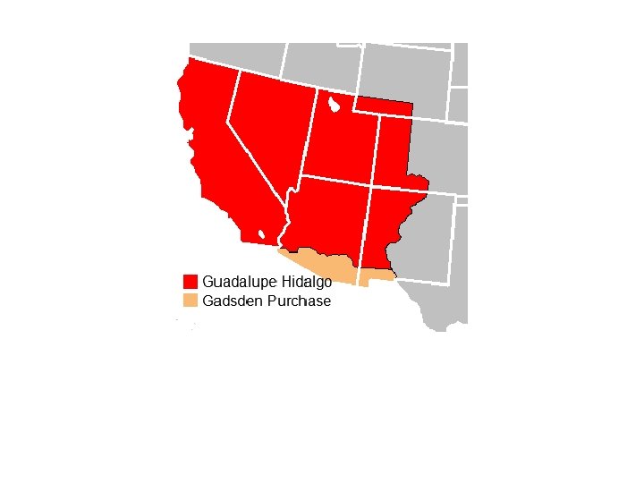 The War with Mexico – The Republic of California • June 1846 American settlers seized the town Sonoma and hoisted flag with Grizzly Bear • Declared it Republic of California • Mexican troops gave way – America Wins the War • Treaty of Guadalupe Hidalgo – Mexico agreed to the Rio Grande as the border between Texas and Mexico and gave New Mexico and California territories to the US. – US agreed to pay $15 million for the Mexican cession – Gadsden Purchase: 5 years later paid Mexico $10 million for another piece of territory south of the Gila River. Finalized 48 states.