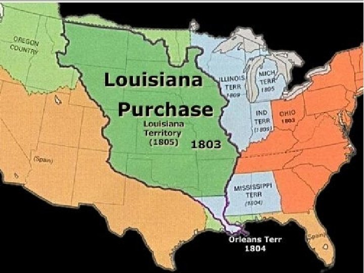 Jefferson’s Presidency – John Marshall and the Supreme Court • Marbury v. Madison (1803) – Chief justice, John Marshall, declared that part of Congress’s Judiciary Act of 1789 was unconstitutional. – Strengthened Supreme Court » Judicial Review: ability of the supreme court to declare law unconstitutional – The Louisiana Purchase • 1800 Spain sold the territory from the Mississippi River west to the Rocky Mountains to France (Napoleon Bonaparte) • 1803 Bonaparte lost interest in the territory and offered to sell it to the United States • Jefferson purchased the Louisiana territory (Louisiana Purchase) for $15 million. • Lewis and Clark, explorers, led a group across the new territory and returned with valuable information about the West and showed that transcontinental travel was possible. – Transcontinental: on the farther side of a continent