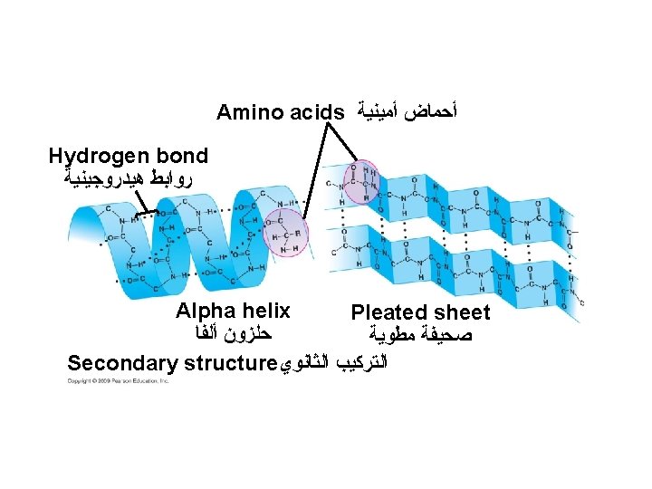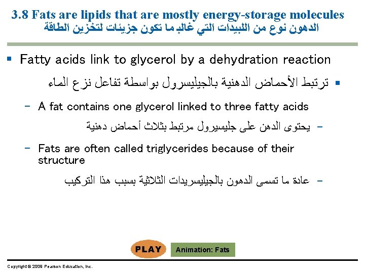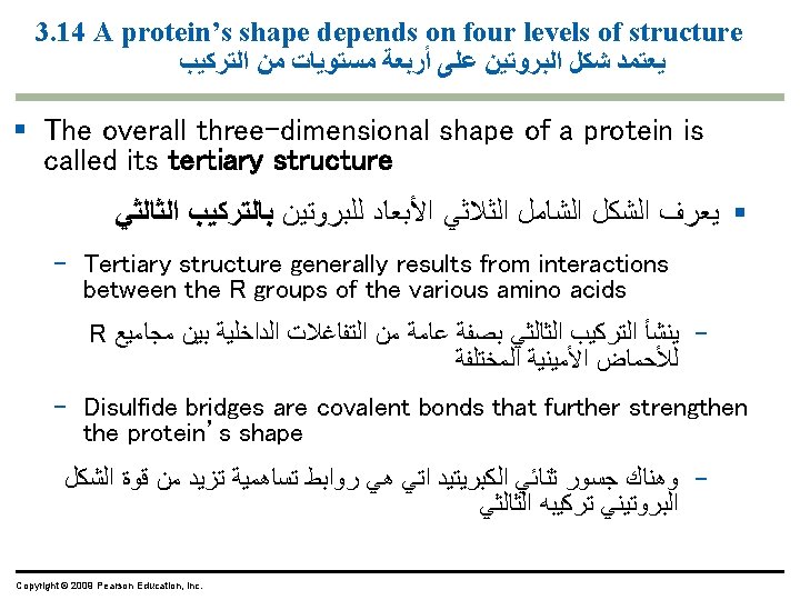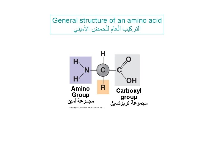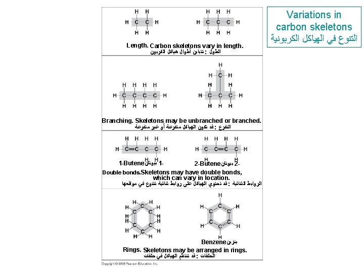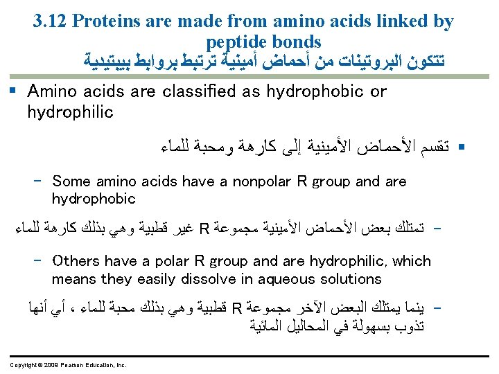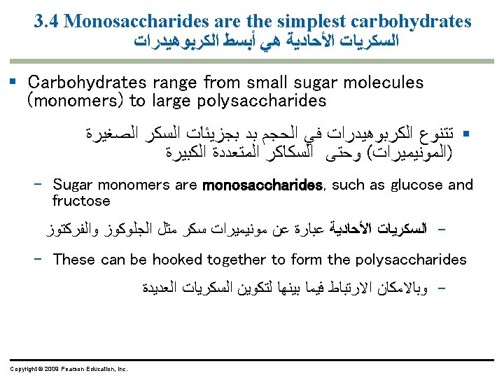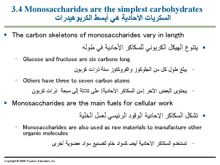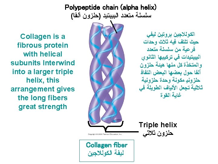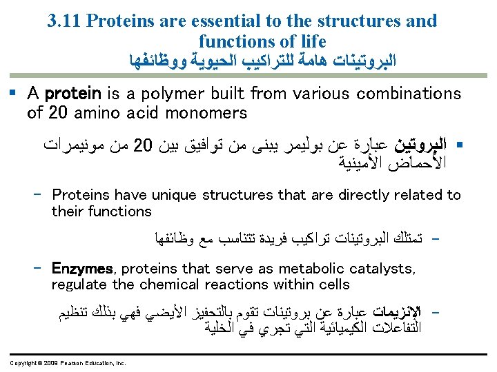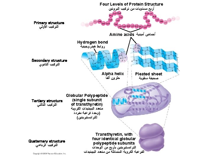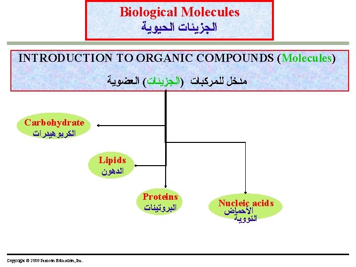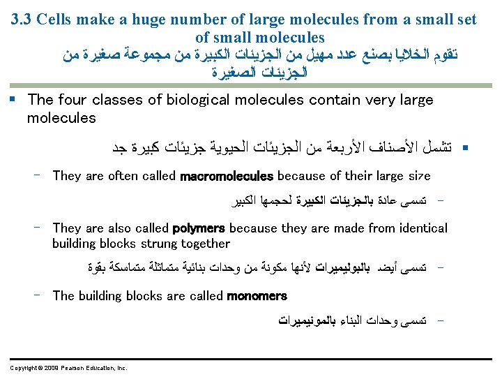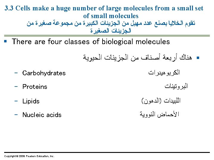 Chapter 3 The Molecules of Cells Power Point Slides: 80 Download presentation Chapter 3 ﺍﻟﺒــﺎﺏ ﺍﻟﺜﺎﻟــﺚ The Molecules of Cells ﺍﻟﺠﺰﻳﺌﺎﺕ ﺍﻟﺨﻠﻮﻳﺔ Power. Point Lectures for Biology: Concepts & Connections, Sixth Edition Campbell, Reece, Taylor, Simon, and Dickey Copyright © 2009 Pearson Education, Inc. Lecture by Richard L. Myers Translated by Nabih Baeshen 3. 1 Life’s molecular diversity is based on the properties of carbon ﻳﻌﺘﻤﺪ ﺗﻨﻮﻉ ﺍﻟﺠﺰﻳﺌﺎﺕ ﺍﻟﺤﻴﻮﻳﺔ ﻋﻠﻰ ﺧﺼﺎﺋﺺ ﺍﻟﻜﺮﺑﻮﻥ – Carbon skeletons can be branched or unbranched – ﻗﺪ ﻳﺘﻔﺮﻉ ﺍﻟﻬﻴﻜﻞ ﺍﻟﻜﺮﺑﻮﻧﻲ ﺃﻮ ﻻ ﻳﺘﻔﺮﻉ – Therefore, different compounds with the same molecular formula can be produced – ﻟﺬﻟﻚ ﻳﻤﻜﻦ ﺇﻧﺘﺎﺝ ﻣﺮﻛﺒﺎﺕ ﻣﺨﺘﻠﻔﺔ ﺑﻨﻔﺲ ﺍﻟﺼﻴﻐﺔ ﺍﻟﺠﺰﻳﺌﻴﺔ – These structures are called isomers – ﺗﻌﺮﻑ ﻫﺬﻩ ﺍﻟﺘﺮﺍﻛﻴﺐ ﺑﺎﻟﻨﻈﺎﺋﺮ Animation: L-Dopa Animation: Carbon Skeletons Animation: Isomers Copyright © 2009 Pearson Education, Inc. CARBOHYDRATES ﺍﻟﻜﺮﺑﻮﻫﻴﺪﺭﺍﺕ Copyright © 2009 Pearson Education, Inc. PROTEINS Copyright © 2009 Pearson Education, Inc. ﺍﻟﺒﺮﻭﺗﻴﻨﺎﺕ 3. 14 A protein’s shape depends on four levels of structure ﻳﻌﺘﻤﺪ ﺷﻜﻞ ﺍﻟﺒﺮﻭﺗﻴﻦ ﻋﻠﻰ ﺃﺮﺑﻌﺔ ﻣﺴﺘﻮﻳﺎﺕ ﻣﻦ ﺍﻟﺘﺮﻛﻴﺐ § Two or more polypeptide chains (subunits) associate providing quaternary structure § ﺗﺘﺤﺪ ﺳﻠﺴﻠﺘﺎﻥ ﺃﻮ ﺃﻜﺜﺮ ) ﻭﺣﺪﺍﺕ ﻓﺮﻋﻴﺔ ( ﻣﻦ ﻣﺘﻌﺪﺩ ﺍﻟﺒﻴﺒﺘﻴﺪ ﻭﻫﻲ ﻓﻲ ﺗﺮﻛﻴﺒﻬﺎ ﺍﻟﺜﺎﻧﻮﻱ ﺃﻮ ﺍﻟﺜﺎﻟﺜﻲ ﻣﻜﻮﻧﺔ ﺍﻟﺘﺮﻛﻴﺐ ﺍﻟﺮﺑﺎﻋﻲ ﻟﻠﺒﺮﻭﺗﻴﻦ – Collagen is an example of a protein with quaternary structure – ﺍﻟﻜﻮﻟﻼﺟﻴﻦ ﻫﻮ ﻣﺜﺎﻝ ﺍﻟﺒﺮﻭﺗﻴﻦ ﻓﻲ ﺗﺮﻛﻴﺒﻪ ﺍﻟﺮﺑﺎﻋﻲ – Its triple helix gives great strength to connective tissue, bone, tendons, and ligaments – ﻳﻌﻄﻲ ﺣﻠﺰﻭﻧﻪ ﺍﻟﺜﻼﺛﻲ ﻗﻮﺓ ﻫﺎﺋﻠﺔ ﻟﻸﻨﺴﺠﺔ ﺍﻟﻀﺎﻣﺔ ﻭﺍﻟﻌﻈﺎﻡ ﻭﺍﻷﻮﺗﺎﺭ ﻭﺍﻷﺮﺑﻄﺔ Animation: Protein Structure Introduction Animation: Primary Protein Structure Animation: Secondary Protein Structure Animation: Tertiary Protein Structure Animation: Quaternary Protein Structure Copyright © 2009 Pearson Education, Inc. NUCLEIC ACIDS ﺍﻷﺤﻤﺎﺽ ﺍﻟﻨﻮﻭﻳﺔ Copyright © 2009 Pearson Education, Inc. Dehydration Short polymer Monomer Hydrolysis Longer polymer