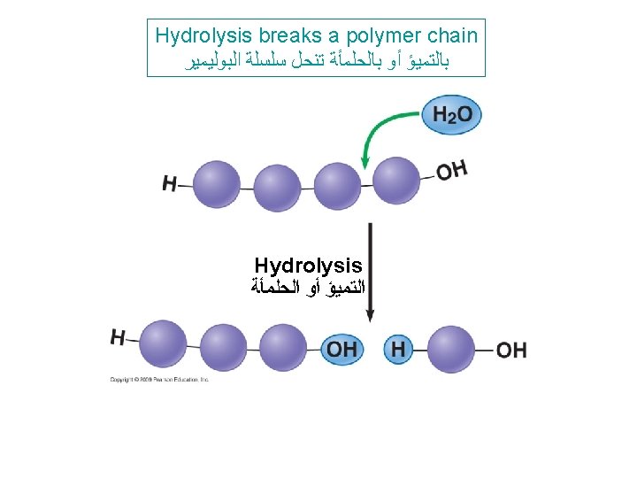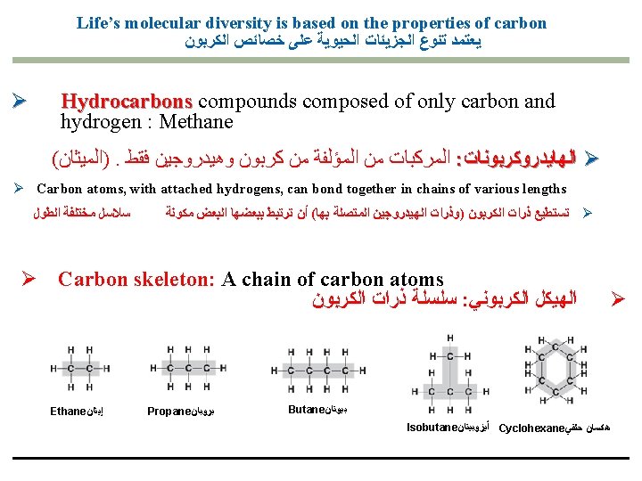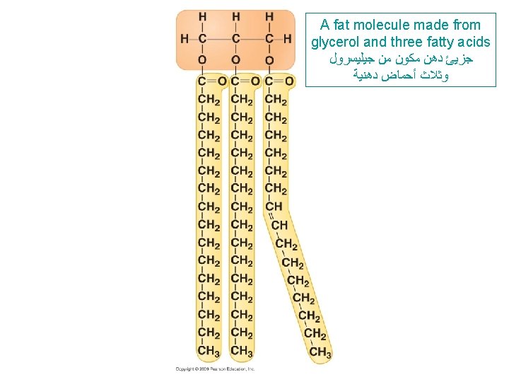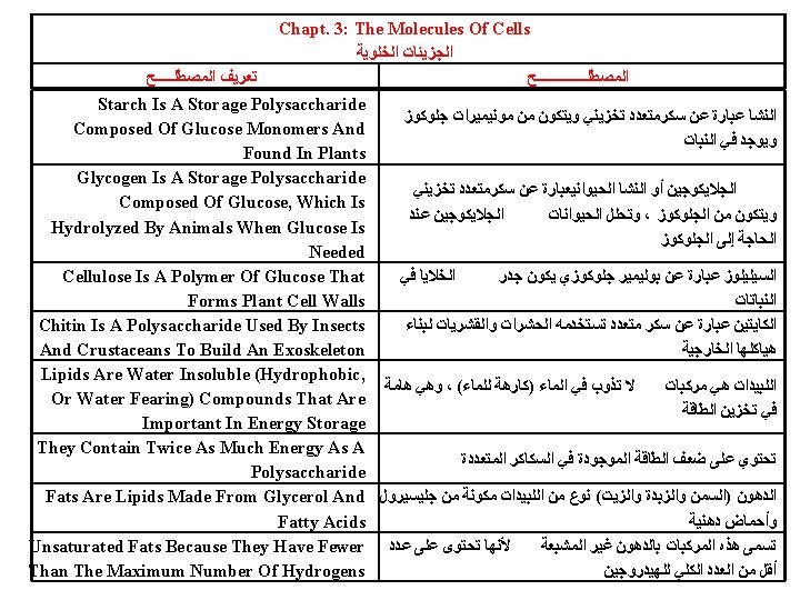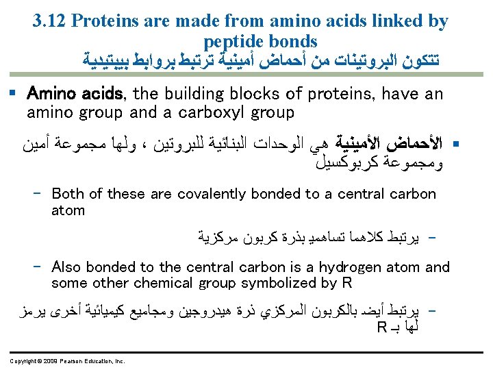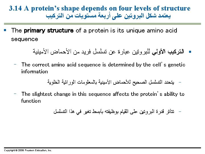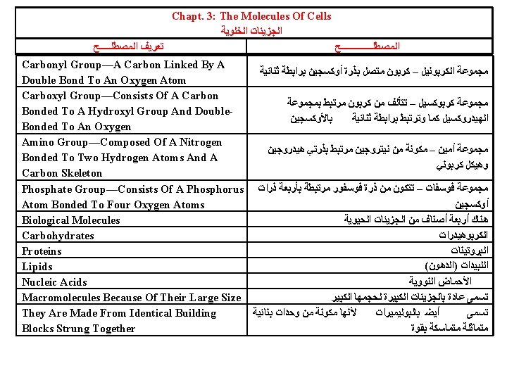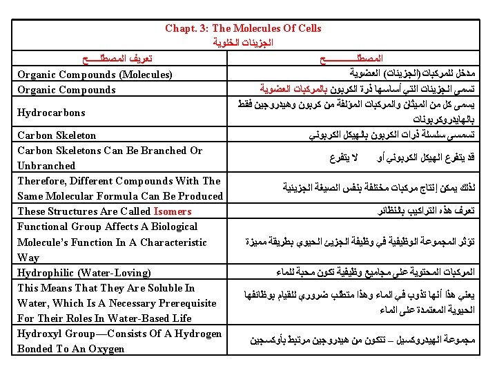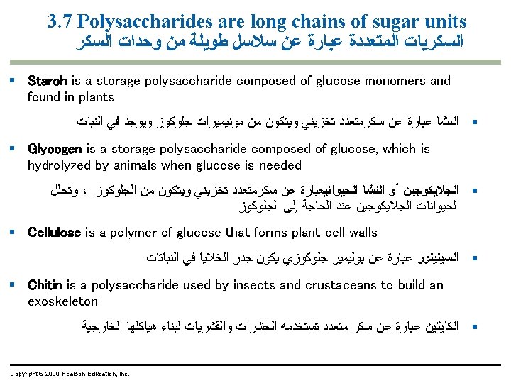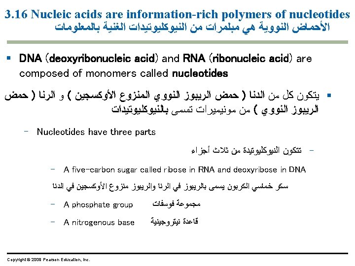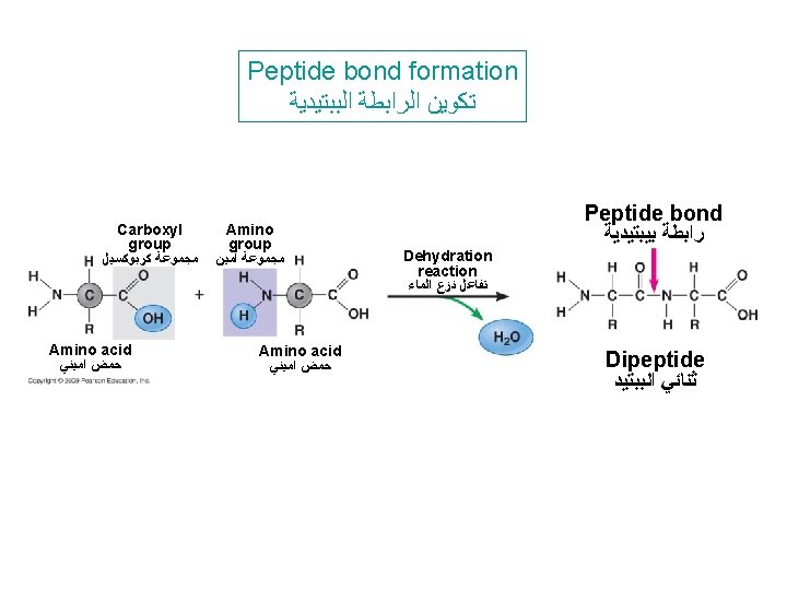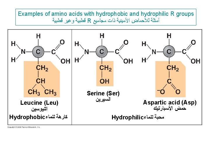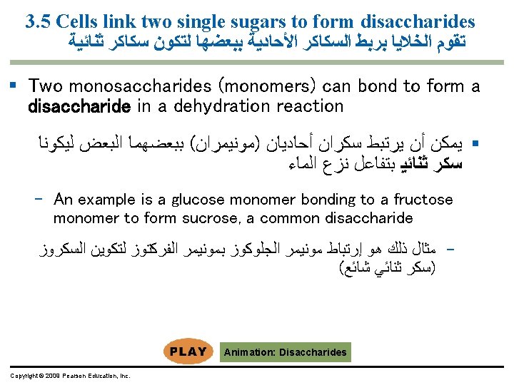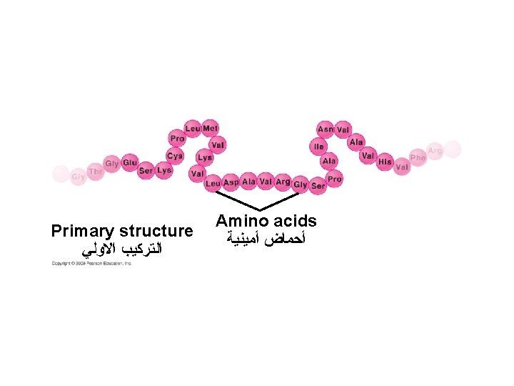 Chapter 3 The Molecules of Cells Power Point Slides: 80 Download presentation Chapter 3 ﺍﻟﺒــﺎﺏ ﺍﻟﺜﺎﻟــﺚ The Molecules of Cells ﺍﻟﺠﺰﻳﺌﺎﺕ ﺍﻟﺨﻠﻮﻳﺔ Power. Point Lectures for Biology: Concepts & Connections, Sixth Edition Campbell, Reece, Taylor, Simon, and Dickey Copyright © 2009 Pearson Education, Inc. Lecture by Richard L. Myers Translated by Nabih Baeshen 3. 1 Life’s molecular diversity is based on the properties of carbon ﻳﻌﺘﻤﺪ ﺗﻨﻮﻉ ﺍﻟﺠﺰﻳﺌﺎﺕ ﺍﻟﺤﻴﻮﻳﺔ ﻋﻠﻰ ﺧﺼﺎﺋﺺ ﺍﻟﻜﺮﺑﻮﻥ – Carbon skeletons can be branched or unbranched – ﻗﺪ ﻳﺘﻔﺮﻉ ﺍﻟﻬﻴﻜﻞ ﺍﻟﻜﺮﺑﻮﻧﻲ ﺃﻮ ﻻ ﻳﺘﻔﺮﻉ – Therefore, different compounds with the same molecular formula can be produced – ﻟﺬﻟﻚ ﻳﻤﻜﻦ ﺇﻧﺘﺎﺝ ﻣﺮﻛﺒﺎﺕ ﻣﺨﺘﻠﻔﺔ ﺑﻨﻔﺲ ﺍﻟﺼﻴﻐﺔ ﺍﻟﺠﺰﻳﺌﻴﺔ – These structures are called isomers – ﺗﻌﺮﻑ ﻫﺬﻩ ﺍﻟﺘﺮﺍﻛﻴﺐ ﺑﺎﻟﻨﻈﺎﺋﺮ Animation: L-Dopa Animation: Carbon Skeletons Animation: Isomers Copyright © 2009 Pearson Education, Inc. CARBOHYDRATES ﺍﻟﻜﺮﺑﻮﻫﻴﺪﺭﺍﺕ Copyright © 2009 Pearson Education, Inc. PROTEINS Copyright © 2009 Pearson Education, Inc. ﺍﻟﺒﺮﻭﺗﻴﻨﺎﺕ 3. 14 A protein’s shape depends on four levels of structure ﻳﻌﺘﻤﺪ ﺷﻜﻞ ﺍﻟﺒﺮﻭﺗﻴﻦ ﻋﻠﻰ ﺃﺮﺑﻌﺔ ﻣﺴﺘﻮﻳﺎﺕ ﻣﻦ ﺍﻟﺘﺮﻛﻴﺐ § Two or more polypeptide chains (subunits) associate providing quaternary structure § ﺗﺘﺤﺪ ﺳﻠﺴﻠﺘﺎﻥ ﺃﻮ ﺃﻜﺜﺮ ) ﻭﺣﺪﺍﺕ ﻓﺮﻋﻴﺔ ( ﻣﻦ ﻣﺘﻌﺪﺩ ﺍﻟﺒﻴﺒﺘﻴﺪ ﻭﻫﻲ ﻓﻲ ﺗﺮﻛﻴﺒﻬﺎ ﺍﻟﺜﺎﻧﻮﻱ ﺃﻮ ﺍﻟﺜﺎﻟﺜﻲ ﻣﻜﻮﻧﺔ ﺍﻟﺘﺮﻛﻴﺐ ﺍﻟﺮﺑﺎﻋﻲ ﻟﻠﺒﺮﻭﺗﻴﻦ – Collagen is an example of a protein with quaternary structure – ﺍﻟﻜﻮﻟﻼﺟﻴﻦ ﻫﻮ ﻣﺜﺎﻝ ﺍﻟﺒﺮﻭﺗﻴﻦ ﻓﻲ ﺗﺮﻛﻴﺒﻪ ﺍﻟﺮﺑﺎﻋﻲ – Its triple helix gives great strength to connective tissue, bone, tendons, and ligaments – ﻳﻌﻄﻲ ﺣﻠﺰﻭﻧﻪ ﺍﻟﺜﻼﺛﻲ ﻗﻮﺓ ﻫﺎﺋﻠﺔ ﻟﻸﻨﺴﺠﺔ ﺍﻟﻀﺎﻣﺔ ﻭﺍﻟﻌﻈﺎﻡ ﻭﺍﻷﻮﺗﺎﺭ ﻭﺍﻷﺮﺑﻄﺔ Animation: Protein Structure Introduction Animation: Primary Protein Structure Animation: Secondary Protein Structure Animation: Tertiary Protein Structure Animation: Quaternary Protein Structure Copyright © 2009 Pearson Education, Inc. NUCLEIC ACIDS ﺍﻷﺤﻤﺎﺽ ﺍﻟﻨﻮﻭﻳﺔ Copyright © 2009 Pearson Education, Inc. Dehydration Short polymer Monomer Hydrolysis Longer polymer