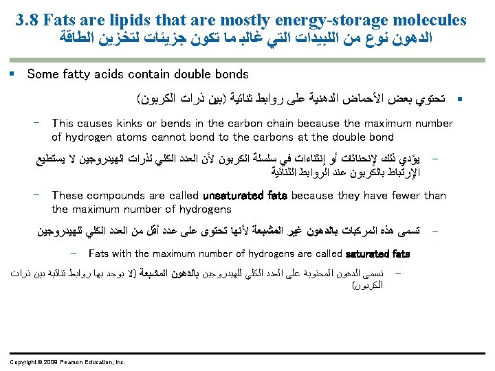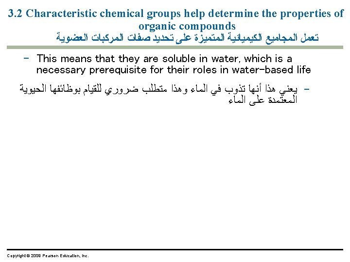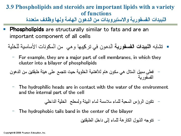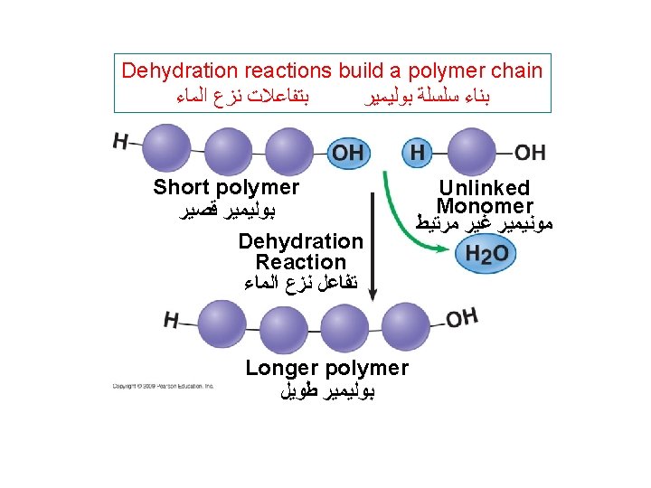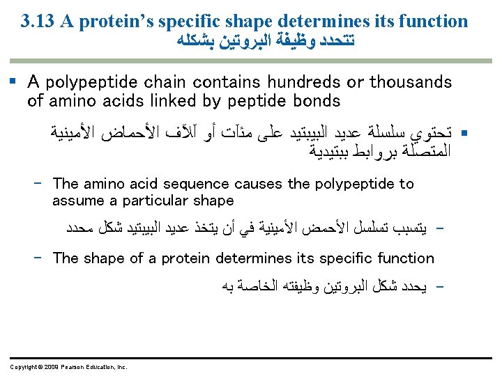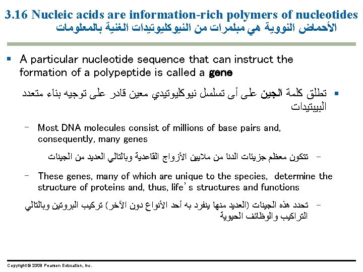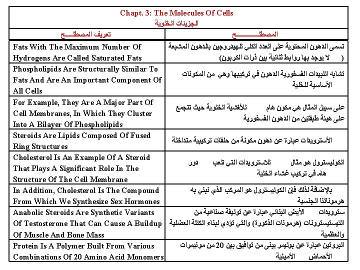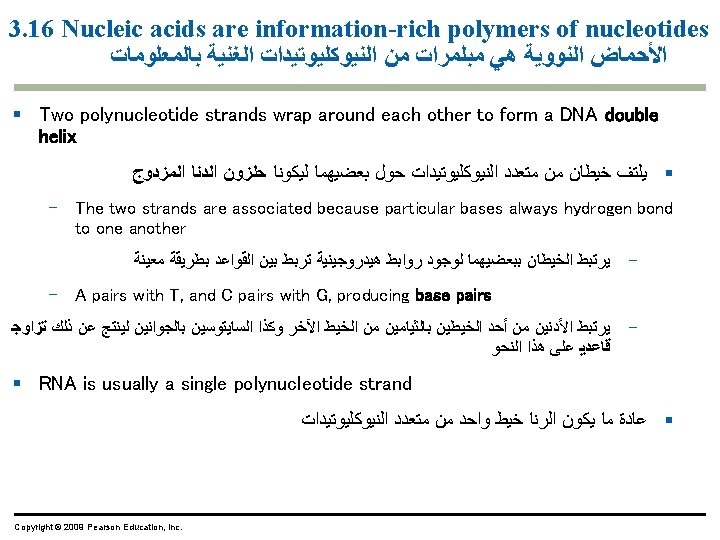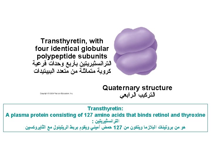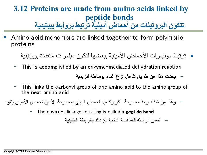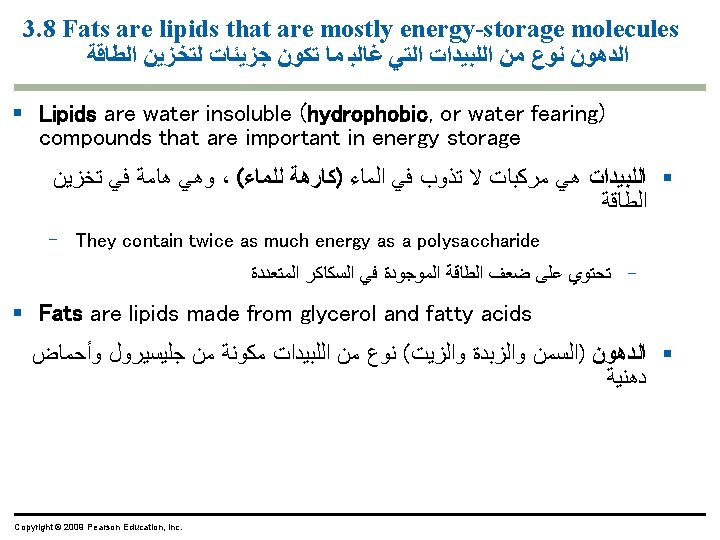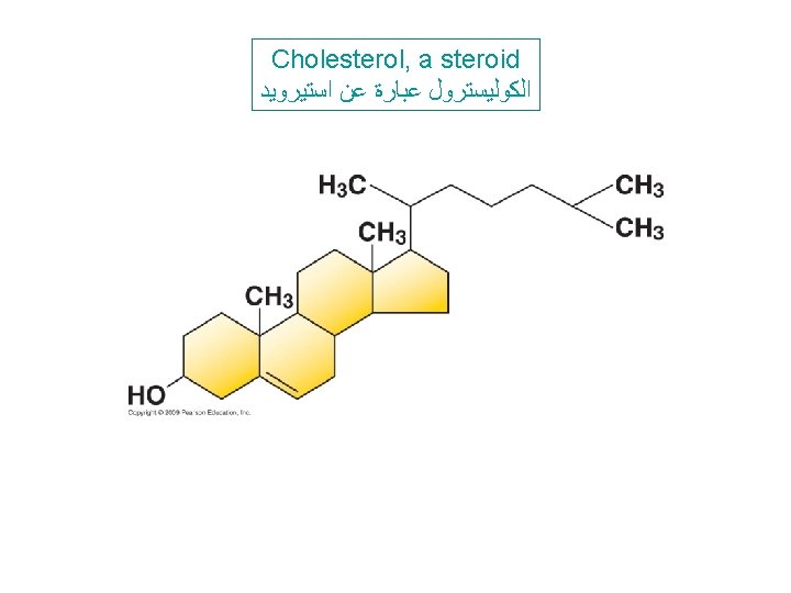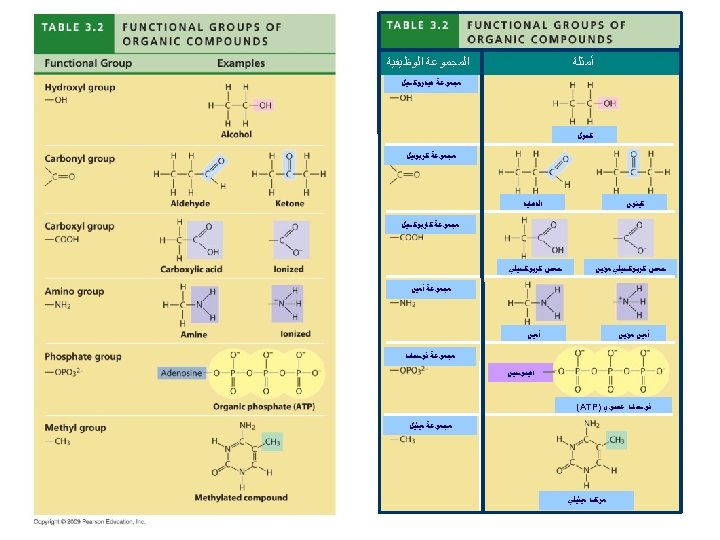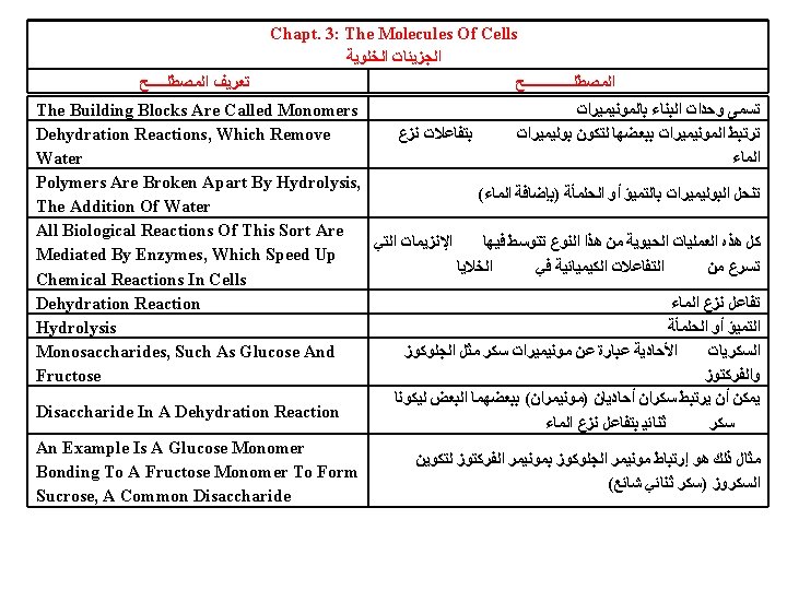 Chapter 3 The Molecules of Cells Power Point Slides: 80 Download presentation Chapter 3 ﺍﻟﺒــﺎﺏ ﺍﻟﺜﺎﻟــﺚ The Molecules of Cells ﺍﻟﺠﺰﻳﺌﺎﺕ ﺍﻟﺨﻠﻮﻳﺔ Power. Point Lectures for Biology: Concepts & Connections, Sixth Edition Campbell, Reece, Taylor, Simon, and Dickey Copyright © 2009 Pearson Education, Inc. Lecture by Richard L. Myers Translated by Nabih Baeshen 3. 1 Life’s molecular diversity is based on the properties of carbon ﻳﻌﺘﻤﺪ ﺗﻨﻮﻉ ﺍﻟﺠﺰﻳﺌﺎﺕ ﺍﻟﺤﻴﻮﻳﺔ ﻋﻠﻰ ﺧﺼﺎﺋﺺ ﺍﻟﻜﺮﺑﻮﻥ – Carbon skeletons can be branched or unbranched – ﻗﺪ ﻳﺘﻔﺮﻉ ﺍﻟﻬﻴﻜﻞ ﺍﻟﻜﺮﺑﻮﻧﻲ ﺃﻮ ﻻ ﻳﺘﻔﺮﻉ – Therefore, different compounds with the same molecular formula can be produced – ﻟﺬﻟﻚ ﻳﻤﻜﻦ ﺇﻧﺘﺎﺝ ﻣﺮﻛﺒﺎﺕ ﻣﺨﺘﻠﻔﺔ ﺑﻨﻔﺲ ﺍﻟﺼﻴﻐﺔ ﺍﻟﺠﺰﻳﺌﻴﺔ – These structures are called isomers – ﺗﻌﺮﻑ ﻫﺬﻩ ﺍﻟﺘﺮﺍﻛﻴﺐ ﺑﺎﻟﻨﻈﺎﺋﺮ Animation: L-Dopa Animation: Carbon Skeletons Animation: Isomers Copyright © 2009 Pearson Education, Inc. CARBOHYDRATES ﺍﻟﻜﺮﺑﻮﻫﻴﺪﺭﺍﺕ Copyright © 2009 Pearson Education, Inc. PROTEINS Copyright © 2009 Pearson Education, Inc. ﺍﻟﺒﺮﻭﺗﻴﻨﺎﺕ 3. 14 A protein’s shape depends on four levels of structure ﻳﻌﺘﻤﺪ ﺷﻜﻞ ﺍﻟﺒﺮﻭﺗﻴﻦ ﻋﻠﻰ ﺃﺮﺑﻌﺔ ﻣﺴﺘﻮﻳﺎﺕ ﻣﻦ ﺍﻟﺘﺮﻛﻴﺐ § Two or more polypeptide chains (subunits) associate providing quaternary structure § ﺗﺘﺤﺪ ﺳﻠﺴﻠﺘﺎﻥ ﺃﻮ ﺃﻜﺜﺮ ) ﻭﺣﺪﺍﺕ ﻓﺮﻋﻴﺔ ( ﻣﻦ ﻣﺘﻌﺪﺩ ﺍﻟﺒﻴﺒﺘﻴﺪ ﻭﻫﻲ ﻓﻲ ﺗﺮﻛﻴﺒﻬﺎ ﺍﻟﺜﺎﻧﻮﻱ ﺃﻮ ﺍﻟﺜﺎﻟﺜﻲ ﻣﻜﻮﻧﺔ ﺍﻟﺘﺮﻛﻴﺐ ﺍﻟﺮﺑﺎﻋﻲ ﻟﻠﺒﺮﻭﺗﻴﻦ – Collagen is an example of a protein with quaternary structure – ﺍﻟﻜﻮﻟﻼﺟﻴﻦ ﻫﻮ ﻣﺜﺎﻝ ﺍﻟﺒﺮﻭﺗﻴﻦ ﻓﻲ ﺗﺮﻛﻴﺒﻪ ﺍﻟﺮﺑﺎﻋﻲ – Its triple helix gives great strength to connective tissue, bone, tendons, and ligaments – ﻳﻌﻄﻲ ﺣﻠﺰﻭﻧﻪ ﺍﻟﺜﻼﺛﻲ ﻗﻮﺓ ﻫﺎﺋﻠﺔ ﻟﻸﻨﺴﺠﺔ ﺍﻟﻀﺎﻣﺔ ﻭﺍﻟﻌﻈﺎﻡ ﻭﺍﻷﻮﺗﺎﺭ ﻭﺍﻷﺮﺑﻄﺔ Animation: Protein Structure Introduction Animation: Primary Protein Structure Animation: Secondary Protein Structure Animation: Tertiary Protein Structure Animation: Quaternary Protein Structure Copyright © 2009 Pearson Education, Inc. NUCLEIC ACIDS ﺍﻷﺤﻤﺎﺽ ﺍﻟﻨﻮﻭﻳﺔ Copyright © 2009 Pearson Education, Inc. Dehydration Short polymer Monomer Hydrolysis Longer polymer