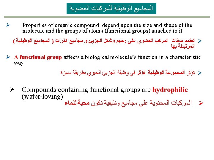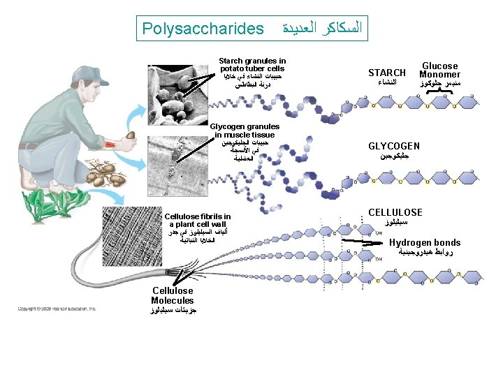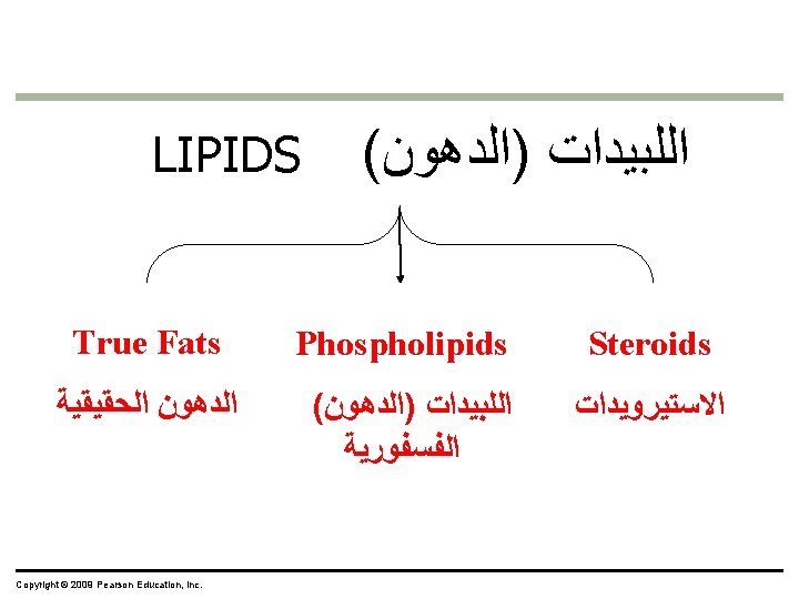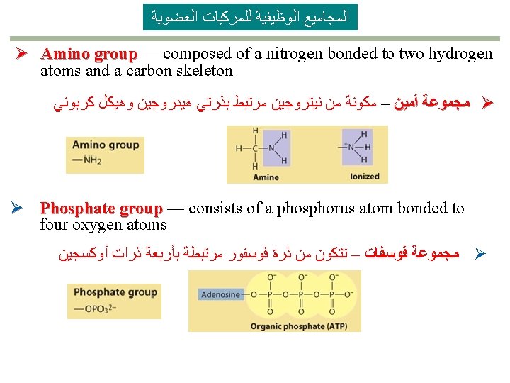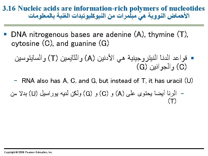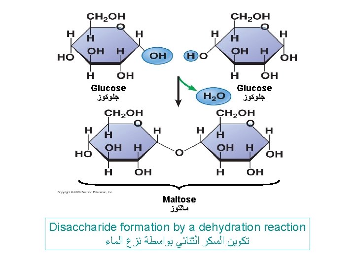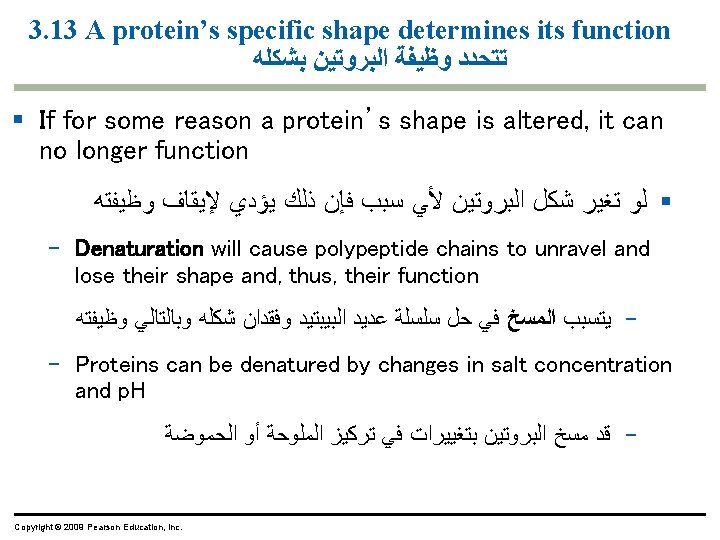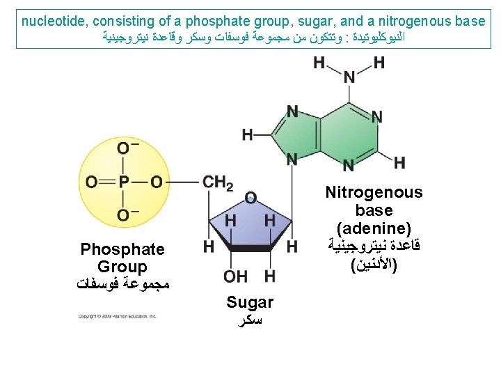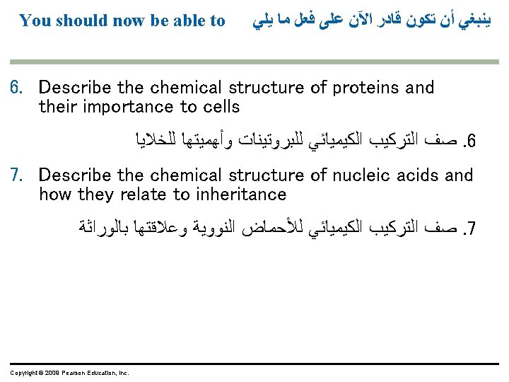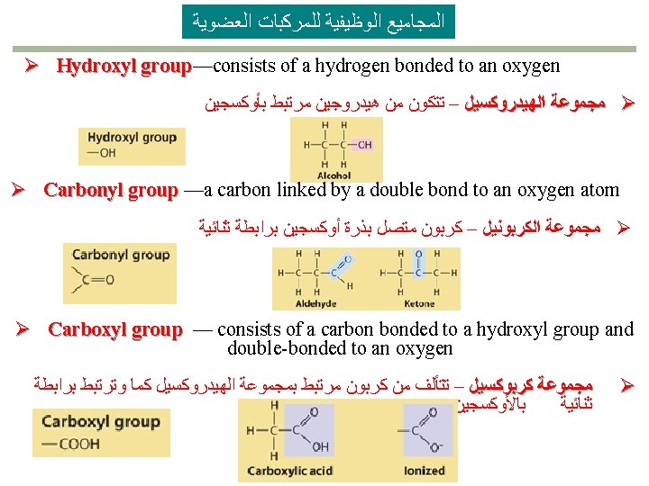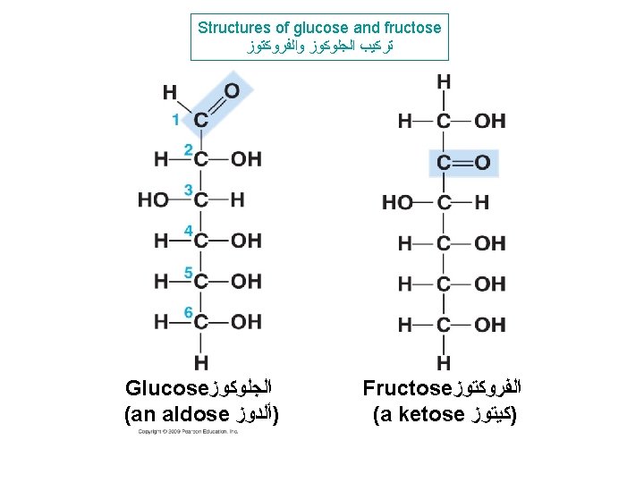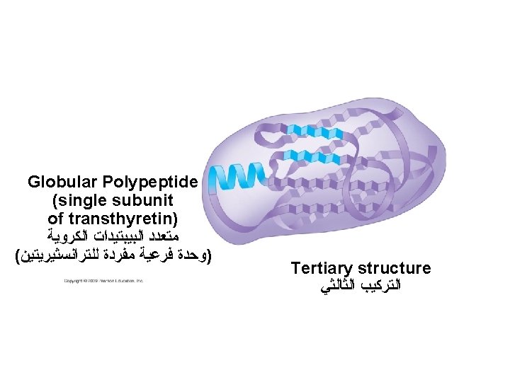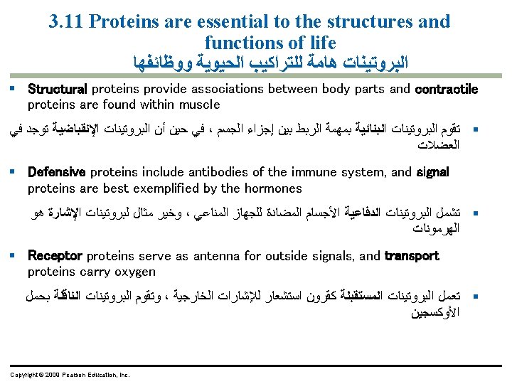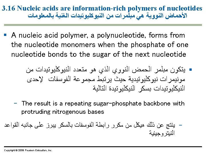 Chapter 3 The Molecules of Cells Power Point Slides: 80 Download presentation Chapter 3 ﺍﻟﺒــﺎﺏ ﺍﻟﺜﺎﻟــﺚ The Molecules of Cells ﺍﻟﺠﺰﻳﺌﺎﺕ ﺍﻟﺨﻠﻮﻳﺔ Power. Point Lectures for Biology: Concepts & Connections, Sixth Edition Campbell, Reece, Taylor, Simon, and Dickey Copyright © 2009 Pearson Education, Inc. Lecture by Richard L. Myers Translated by Nabih Baeshen 3. 1 Life’s molecular diversity is based on the properties of carbon ﻳﻌﺘﻤﺪ ﺗﻨﻮﻉ ﺍﻟﺠﺰﻳﺌﺎﺕ ﺍﻟﺤﻴﻮﻳﺔ ﻋﻠﻰ ﺧﺼﺎﺋﺺ ﺍﻟﻜﺮﺑﻮﻥ – Carbon skeletons can be branched or unbranched – ﻗﺪ ﻳﺘﻔﺮﻉ ﺍﻟﻬﻴﻜﻞ ﺍﻟﻜﺮﺑﻮﻧﻲ ﺃﻮ ﻻ ﻳﺘﻔﺮﻉ – Therefore, different compounds with the same molecular formula can be produced – ﻟﺬﻟﻚ ﻳﻤﻜﻦ ﺇﻧﺘﺎﺝ ﻣﺮﻛﺒﺎﺕ ﻣﺨﺘﻠﻔﺔ ﺑﻨﻔﺲ ﺍﻟﺼﻴﻐﺔ ﺍﻟﺠﺰﻳﺌﻴﺔ – These structures are called isomers – ﺗﻌﺮﻑ ﻫﺬﻩ ﺍﻟﺘﺮﺍﻛﻴﺐ ﺑﺎﻟﻨﻈﺎﺋﺮ Animation: L-Dopa Animation: Carbon Skeletons Animation: Isomers Copyright © 2009 Pearson Education, Inc. CARBOHYDRATES ﺍﻟﻜﺮﺑﻮﻫﻴﺪﺭﺍﺕ Copyright © 2009 Pearson Education, Inc. PROTEINS Copyright © 2009 Pearson Education, Inc. ﺍﻟﺒﺮﻭﺗﻴﻨﺎﺕ 3. 14 A protein’s shape depends on four levels of structure ﻳﻌﺘﻤﺪ ﺷﻜﻞ ﺍﻟﺒﺮﻭﺗﻴﻦ ﻋﻠﻰ ﺃﺮﺑﻌﺔ ﻣﺴﺘﻮﻳﺎﺕ ﻣﻦ ﺍﻟﺘﺮﻛﻴﺐ § Two or more polypeptide chains (subunits) associate providing quaternary structure § ﺗﺘﺤﺪ ﺳﻠﺴﻠﺘﺎﻥ ﺃﻮ ﺃﻜﺜﺮ ) ﻭﺣﺪﺍﺕ ﻓﺮﻋﻴﺔ ( ﻣﻦ ﻣﺘﻌﺪﺩ ﺍﻟﺒﻴﺒﺘﻴﺪ ﻭﻫﻲ ﻓﻲ ﺗﺮﻛﻴﺒﻬﺎ ﺍﻟﺜﺎﻧﻮﻱ ﺃﻮ ﺍﻟﺜﺎﻟﺜﻲ ﻣﻜﻮﻧﺔ ﺍﻟﺘﺮﻛﻴﺐ ﺍﻟﺮﺑﺎﻋﻲ ﻟﻠﺒﺮﻭﺗﻴﻦ – Collagen is an example of a protein with quaternary structure – ﺍﻟﻜﻮﻟﻼﺟﻴﻦ ﻫﻮ ﻣﺜﺎﻝ ﺍﻟﺒﺮﻭﺗﻴﻦ ﻓﻲ ﺗﺮﻛﻴﺒﻪ ﺍﻟﺮﺑﺎﻋﻲ – Its triple helix gives great strength to connective tissue, bone, tendons, and ligaments – ﻳﻌﻄﻲ ﺣﻠﺰﻭﻧﻪ ﺍﻟﺜﻼﺛﻲ ﻗﻮﺓ ﻫﺎﺋﻠﺔ ﻟﻸﻨﺴﺠﺔ ﺍﻟﻀﺎﻣﺔ ﻭﺍﻟﻌﻈﺎﻡ ﻭﺍﻷﻮﺗﺎﺭ ﻭﺍﻷﺮﺑﻄﺔ Animation: Protein Structure Introduction Animation: Primary Protein Structure Animation: Secondary Protein Structure Animation: Tertiary Protein Structure Animation: Quaternary Protein Structure Copyright © 2009 Pearson Education, Inc. NUCLEIC ACIDS ﺍﻷﺤﻤﺎﺽ ﺍﻟﻨﻮﻭﻳﺔ Copyright © 2009 Pearson Education, Inc. Dehydration Short polymer Monomer Hydrolysis Longer polymer